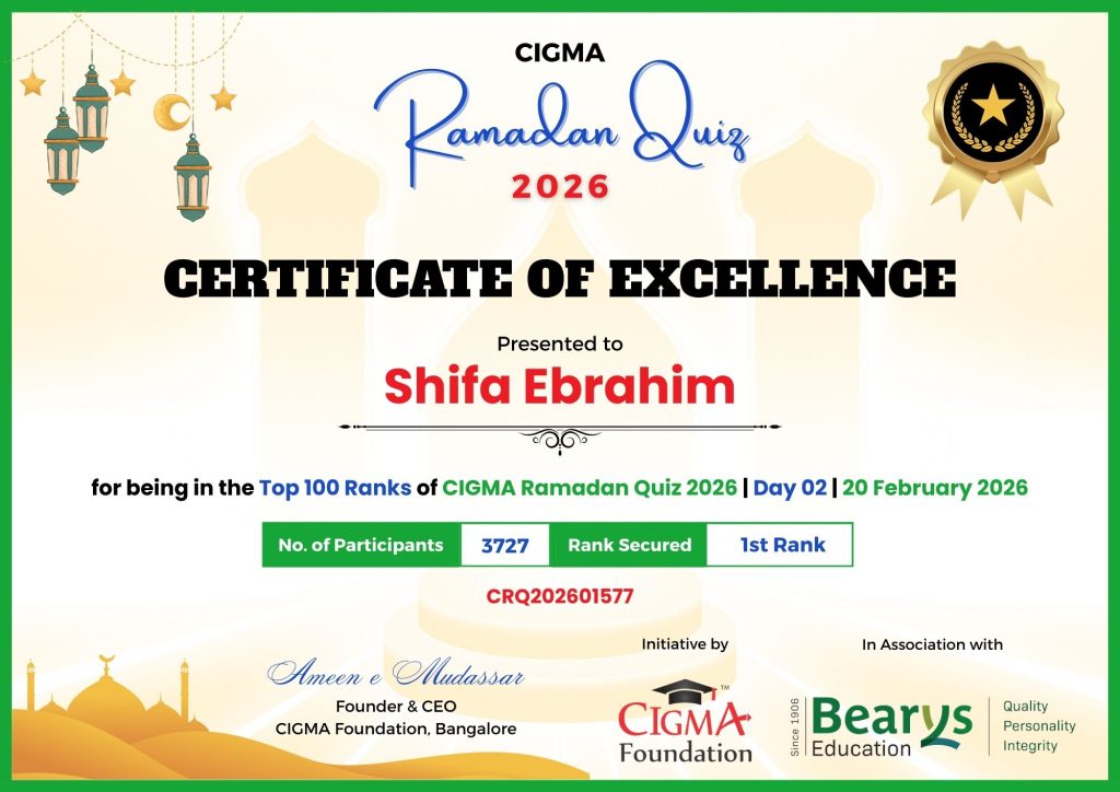 Congratulations to Shifa Ebrahim for her Outstanding Performance in CIGMA Ramadan Quiz 2026Day 02 held on 20 February 2026 and Secured the 1st Rank out of 3727 Participants