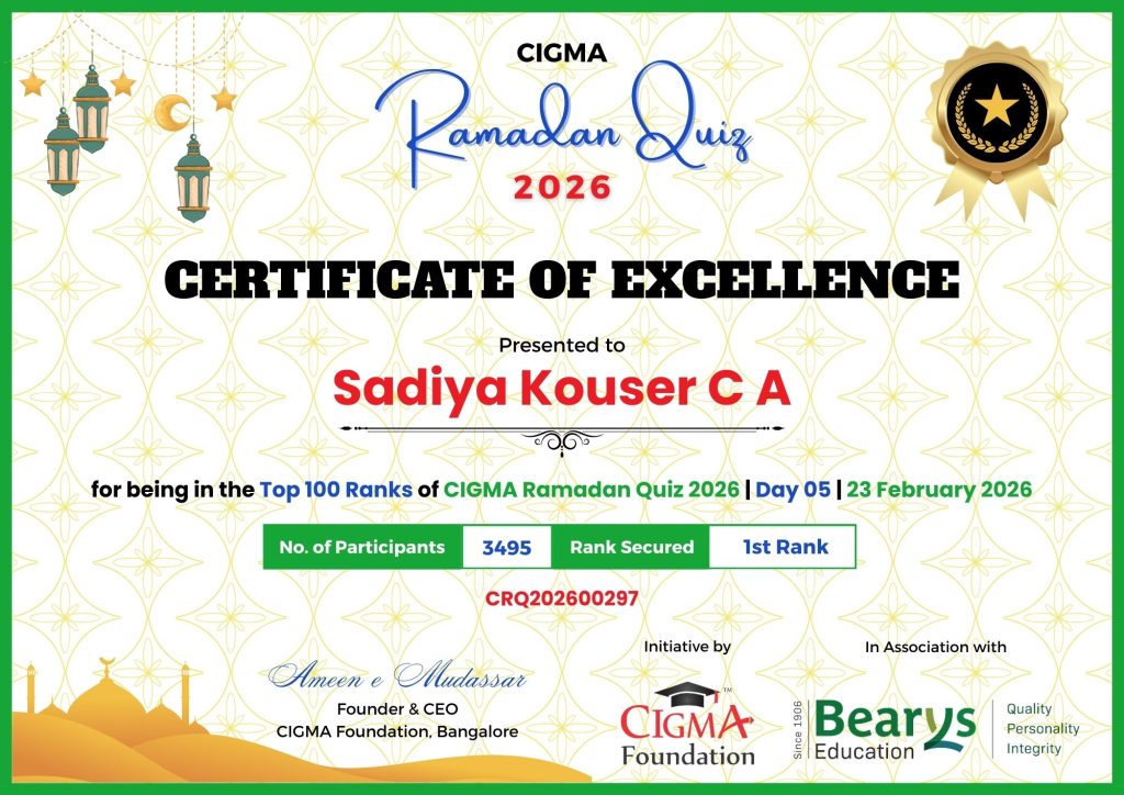 Congratulations to Sadiya Kousar C A for her Outstanding Performance in CIGMA Ramadan Quiz 2026 – Day 05 held on 23 February 2026 and Secured the 1st Rank out of 3495 Participants