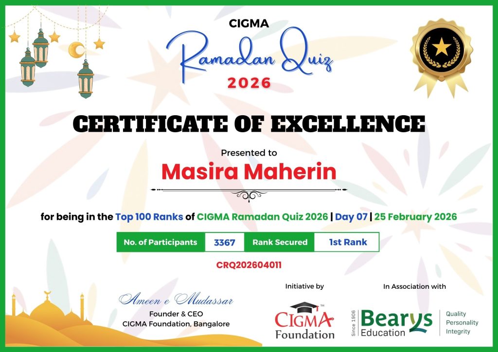 Congratulations to Masira Maherin for her Outstanding Performance in CIGMA Ramadan Quiz 2026 – Day 07 held on 25 February 2026 and Secured the 1st Rank out of 3367 Participants