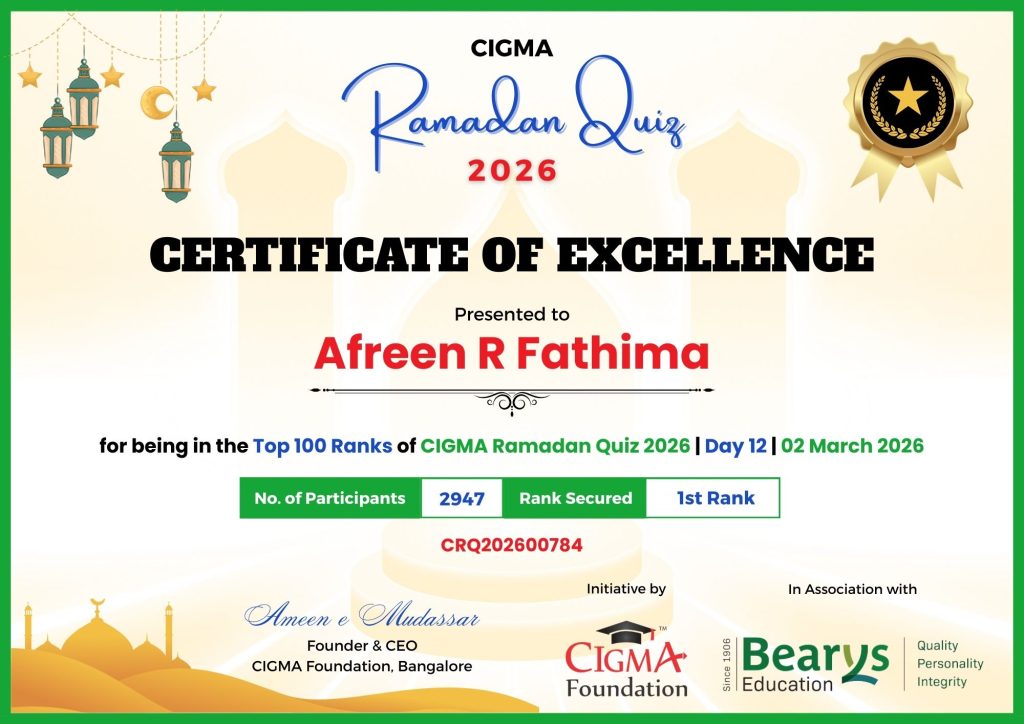 Congratulations to Afreen R Fathima for her Outstanding Performance in CIGMA Ramadan Quiz 2026 – Day 12 held on 02 March 2026 and Secured the 1st Rank out of 2947 Participants