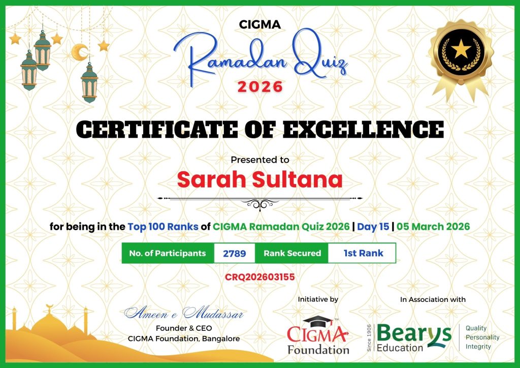 Congratulations to Sarah Sultana for her Outstanding Performance in CIGMA Ramadan Quiz 2026 – Day 15 held on 05 March 2026 and Secured the 1st Rank out of 2789 Participants