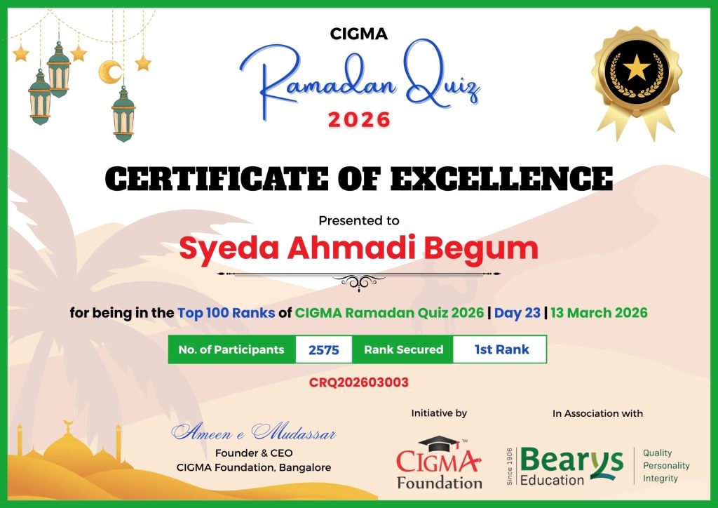 Congratulations to Syeda Ahmadi Begum for her Outstanding Performance in CIGMA Ramadan Quiz 2026 – Day 23 held on 13 March 2026 and Secured the 1st Rank out of 2575 Participants