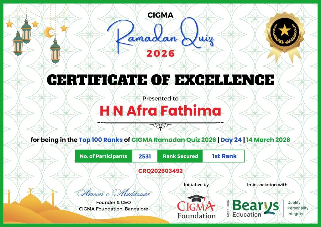 Congratulations to H N Arfa Fathima for her Outstanding Performance in CIGMA Ramadan Quiz 2026 – Day 24 held on 14 March 2026 and Secured the 1st Rank out of 2531 Participants